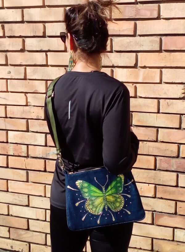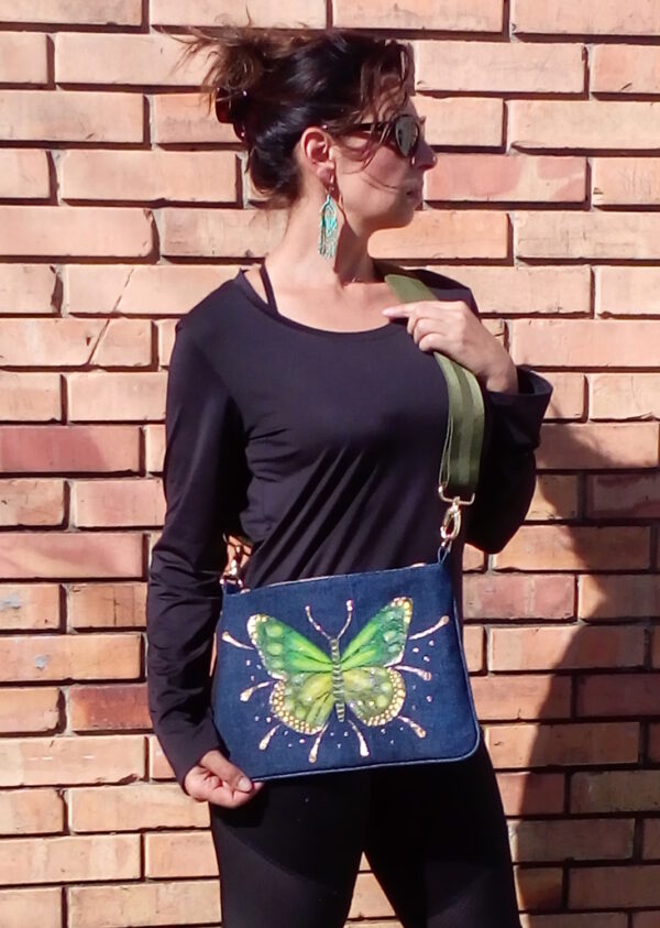 Bolso en jean con Mariposa pintado a mano, texturas doradas.
