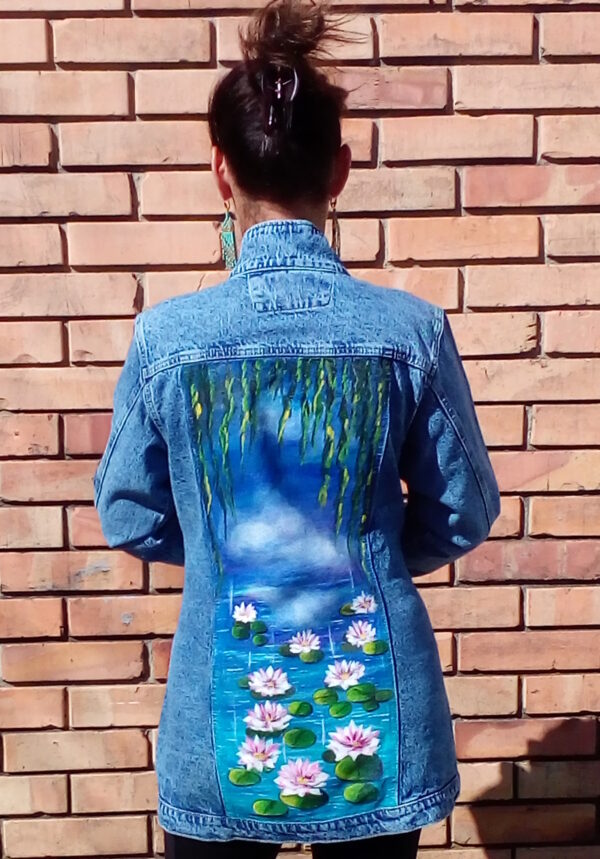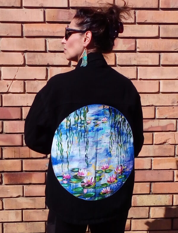 Chaqueta en jean con Nenúfares homenaje a Claude Monet pintada a mano. Pintura textil de excelente calidad y sellante. Disponible modelo tipo gabán en azul stone o en azul frost, tallas S, M, L. Disponible modelo cazadora en talla única (over-size L-XL) en color beige o negro.